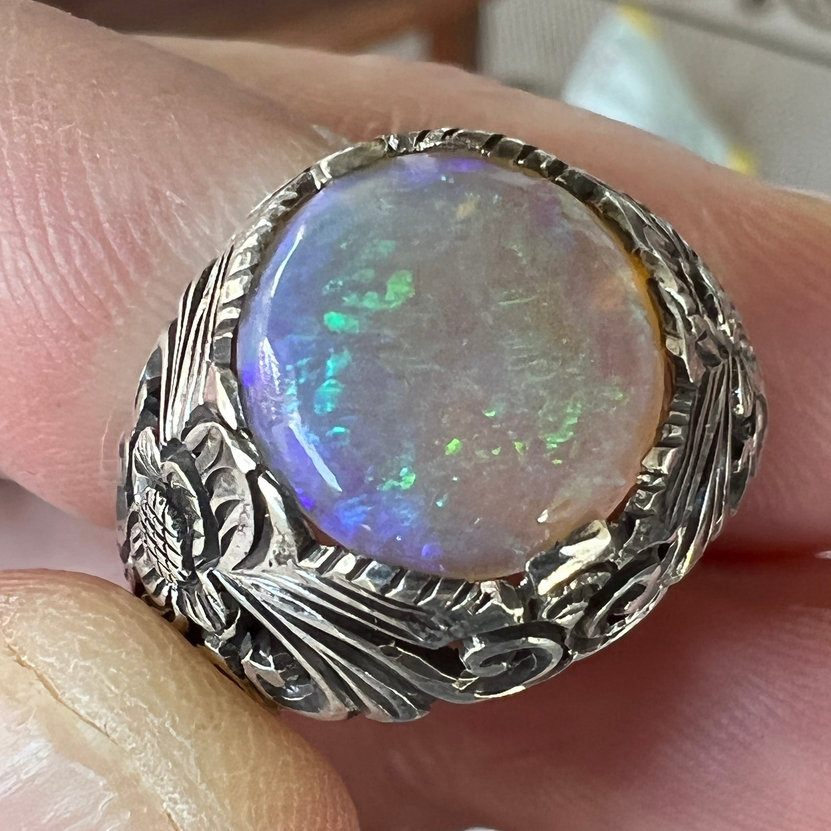 Beautiful one-off bespoke piece showing off a beautiful round cabochon Coober Pedy crystal opal, displaying magnificent greens.
